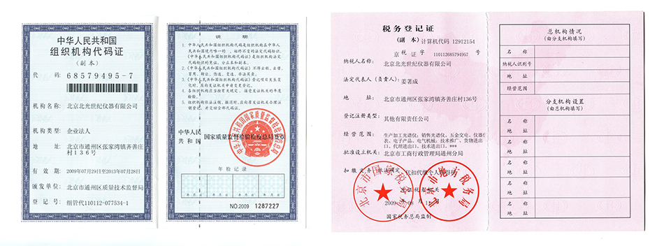北京光學儀器廠證明文件 報關單位登記證書 中國儀器儀表協會證書